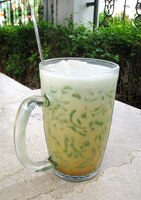 緑色の米粉麺状ゼリーを、ココナッツミルク+ヤシ砂糖のシロップに入れて、氷と一緒に食べる冷菓。